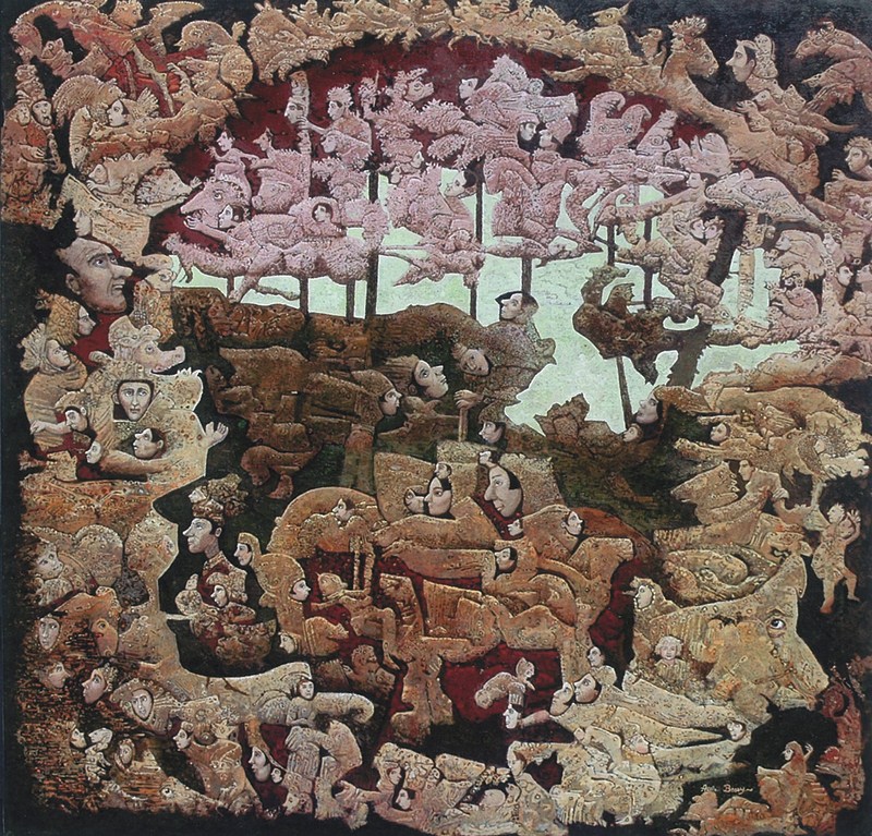 Le monde fantasmagorique d'Adèle Bessy... Face à ses Å?uvres, le visiteur est forcément ébahi en constatant la totale démesure de l'artiste. De véritables grappes humaines se bousculent sur la toile, se chevauchent, confrontent leur monstruosité, deviennent centaures, griffons...La précision du pinceau de l'artiste, la finesse du détail, le tout traité dans des couleurs de brun vert glauques, des ocres violacées, une gamme chromatique qui confèrent à son Å?uvre une puissance expressive tout à fait originale.