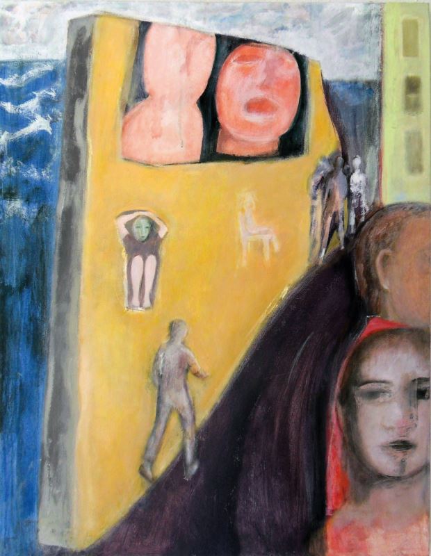 Les personnages habitent des espaces colorés, font parfois obstacle des murs de pierre, dâ??eau, des pyramides de verreâ?¦, contextes de fictions urbaines. Les visages ne cherchent pas à être particularisés, les scènes restent ouvertes à lâ??interprétation. Ainsi les peintures laissent apparaître dans une matière fluide des strates de sensations, de souvenirs, de rappels anciens ou modernistes.