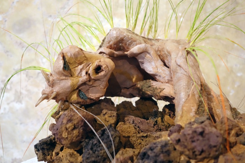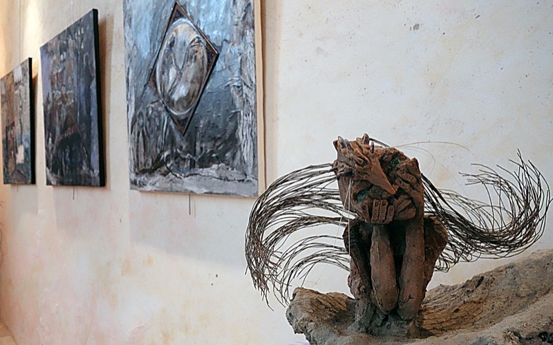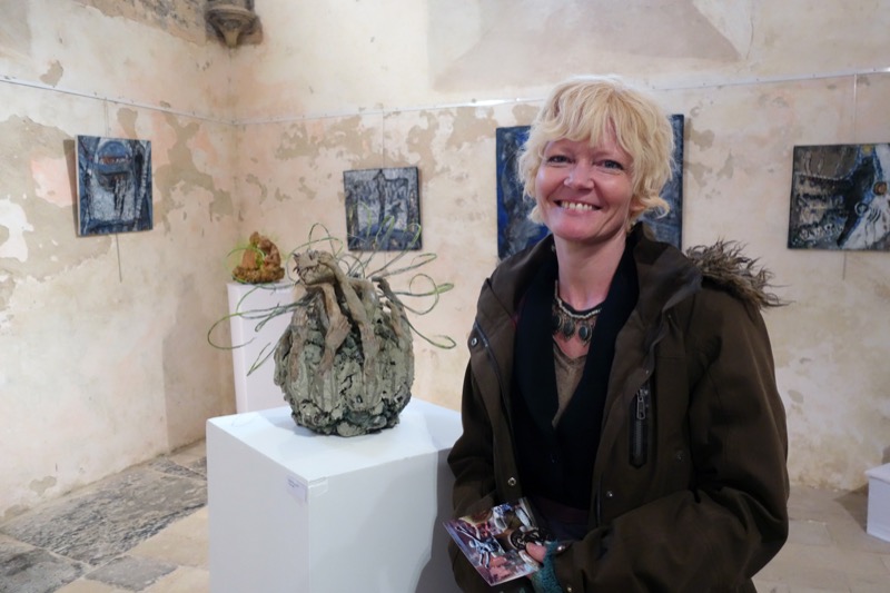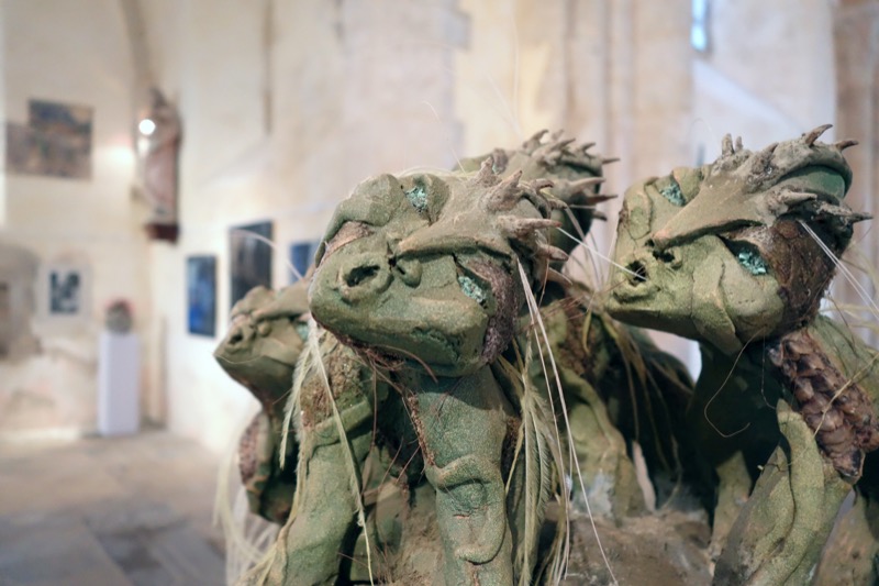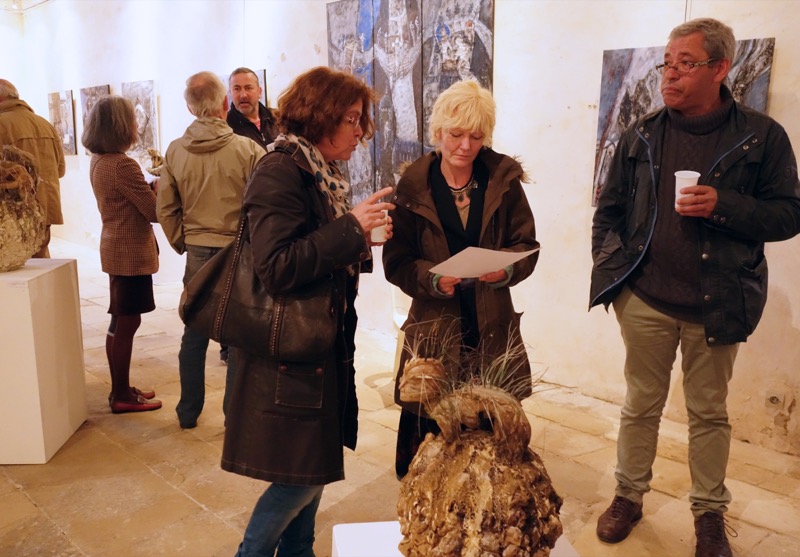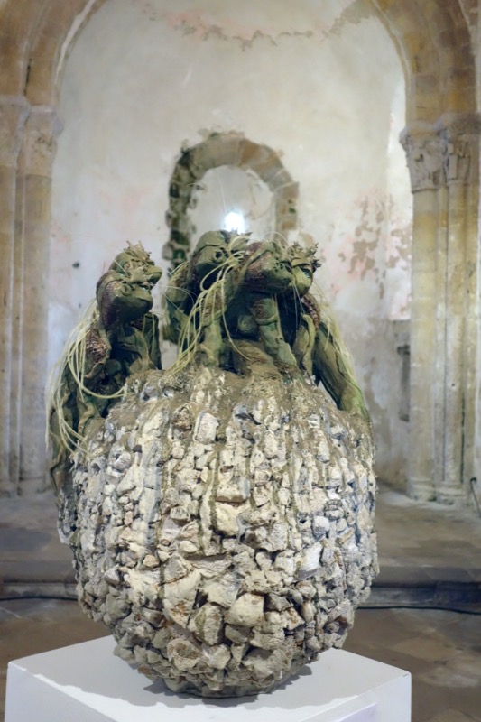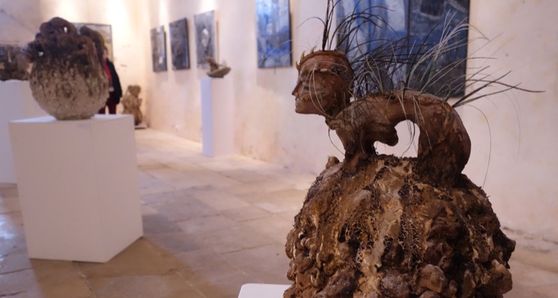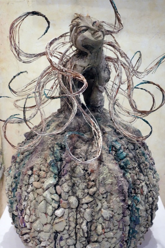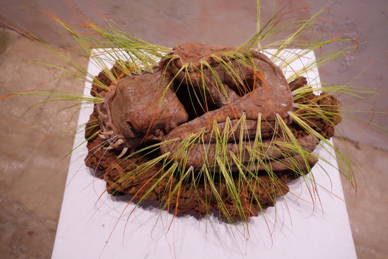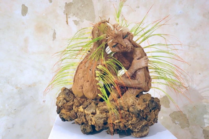Isabelle Levéel sâ??attarde sur la gestuelle du corps et lâ??émotion de lâ??individu. Elle sculpte son être imaginaire, un mélange dâ??homme et de reptile, au regard interrogateur, sortant tout droit des entrailles de la terre. Alors se forme un dos voûté, mélangeant plumes, écailles, griffes et roches volcaniques.Cette créature sensible déploie une forme dâ??énergie autour dâ??elle, qui représente le moment actuel. Ne doit-on pas y voir une certaine vérité sur notre société fragile qui pense à demain, pour en oublier lâ??essentiel, le présentâ?¦