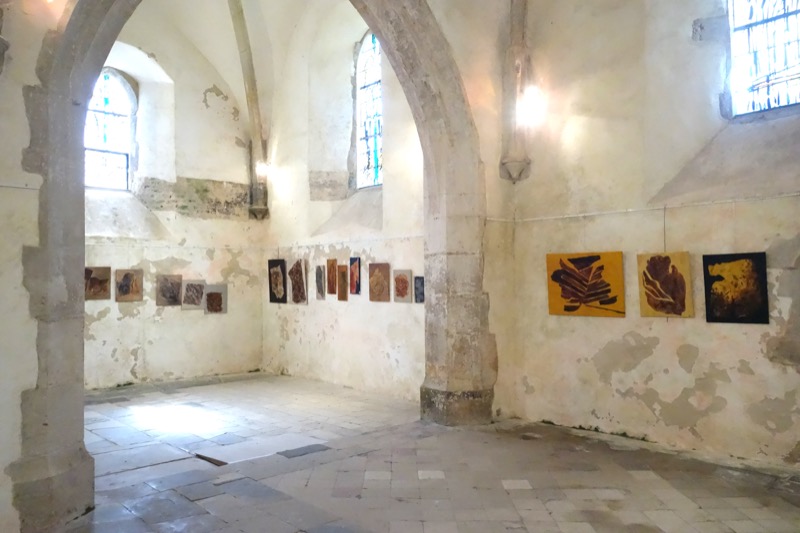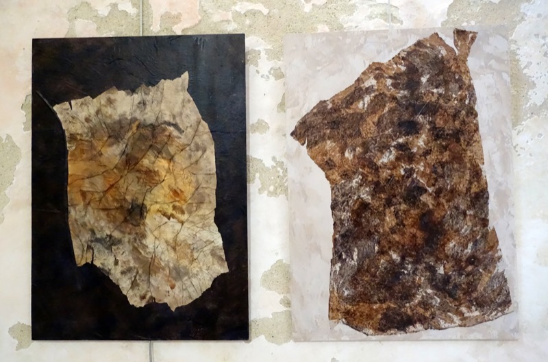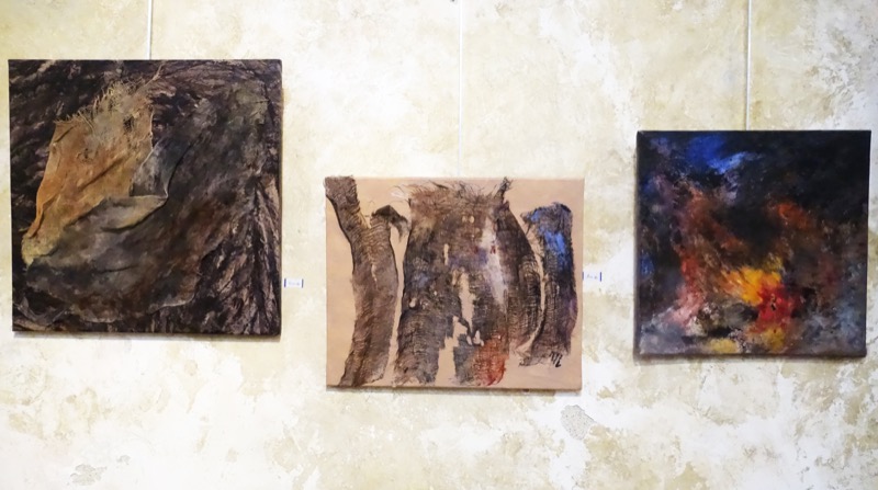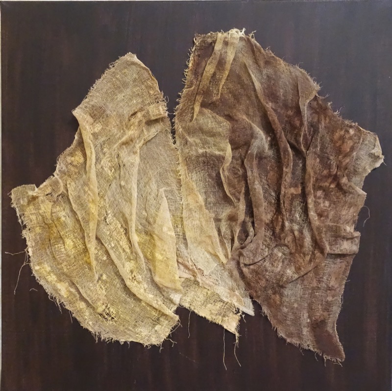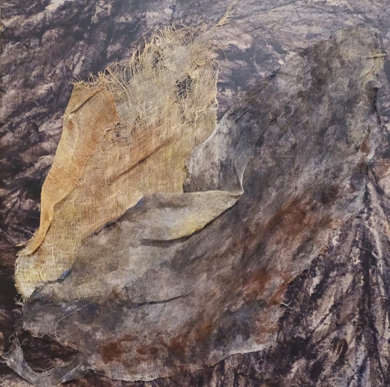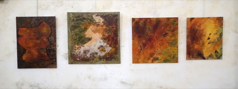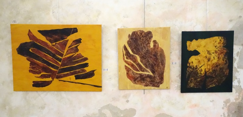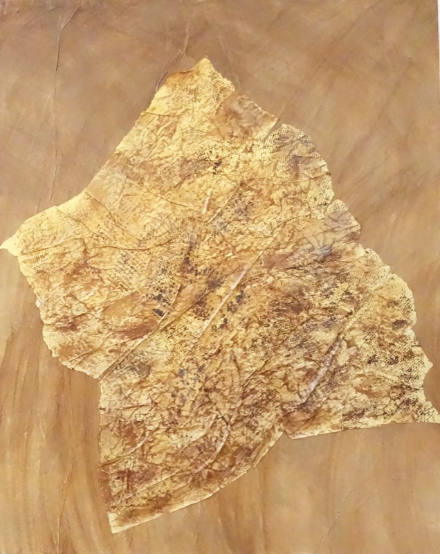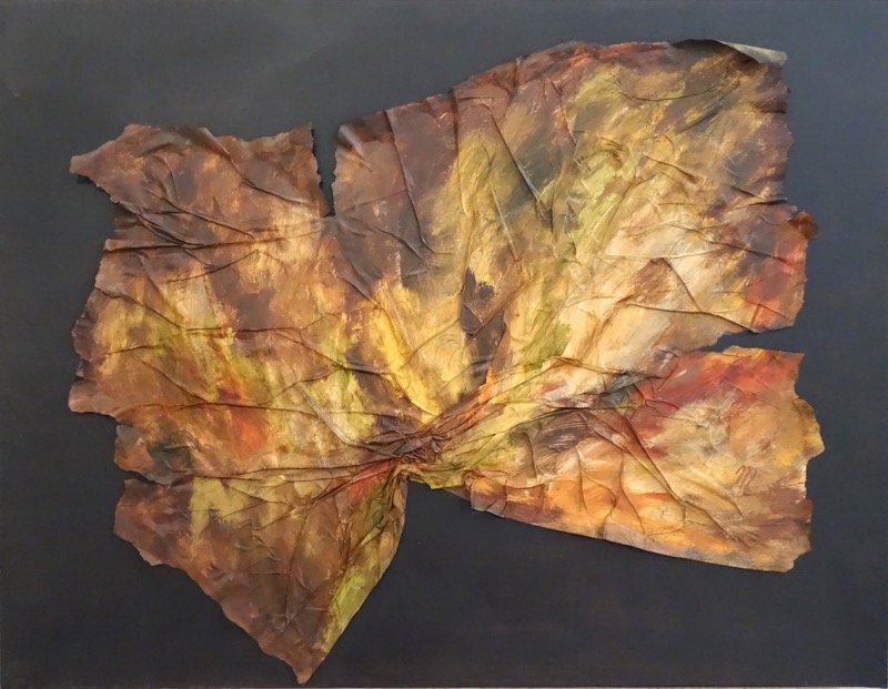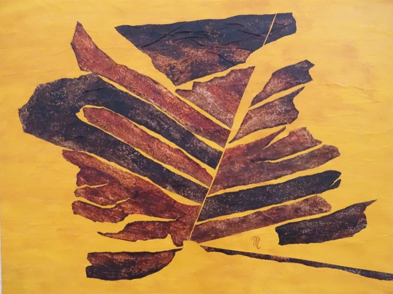 Les feuilles mortes ont inspiré le sujet exposé. Ingrédients : acrylique, pinceaux, papier froissé, découpé, déchiré, marouflé sur toile et autres matériaux. Figuratif, abstrait ? A chacun de voir. Importance du geste.