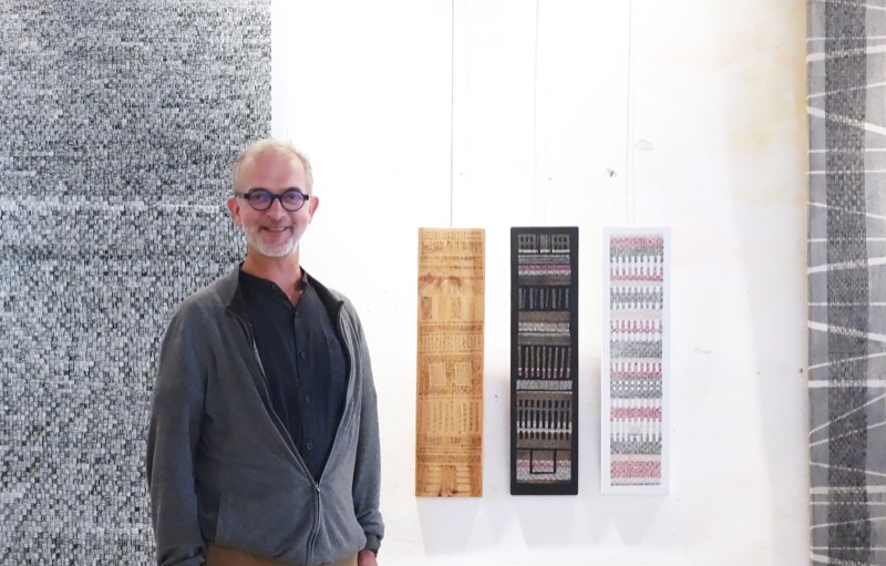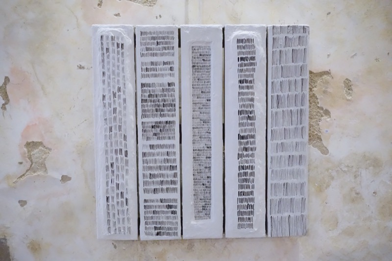 Des traits peints, gravés, dessinés qui se font signe, parfois écriture. Ils forment une sorte de trame qui se poursuit jour après jour sur des supports variés. Trame du quotidien tissée par la répétition dâ??un même trait ponctuant le temps présent. Les traits sont animés par le rythme dâ??une respiration sans cesse recommencée et prennent sens par leur régularité et la fidélité de leur tracé.