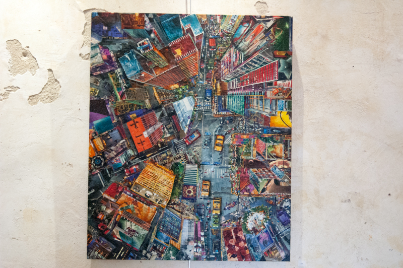 Lâ??artiste-peintre est belge dâ??origine, actuellement en résidence au pied du massif des Albères. Sa série consacrée aux villes contemporaines recrée, à partir de collages et de techniques mixtes, des perspectives étonnantes. Surprise : à la première vision on reconnaît une cité foisonnante de couleurs, de lumières, de mouvements. Ces mégalopoles à travers le monde, on croit les reconnaître, on sâ??y projette, et on en revient comme dâ??un vrai voyage : changé.