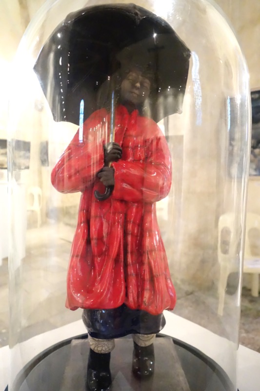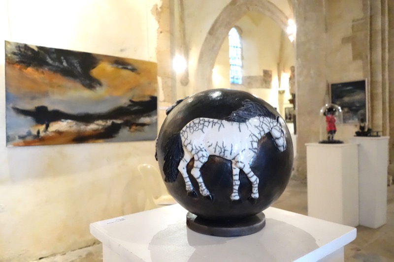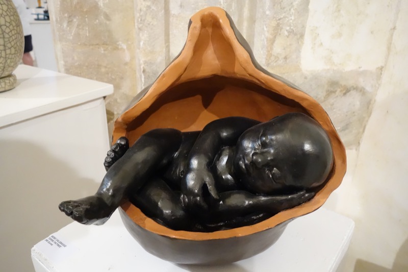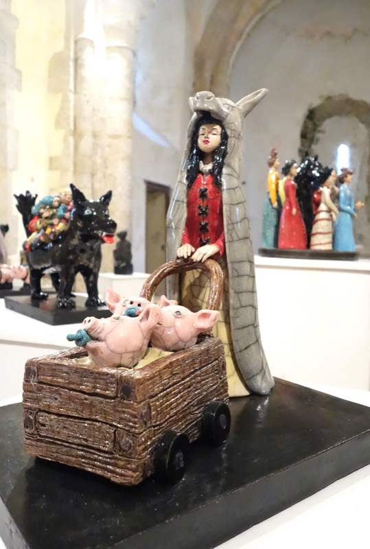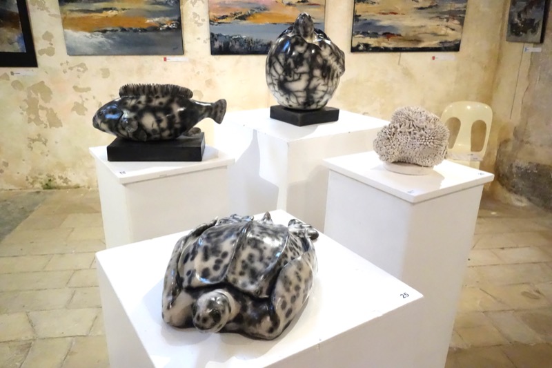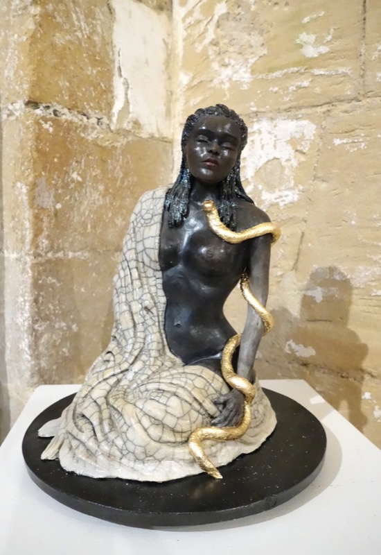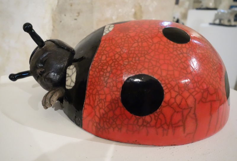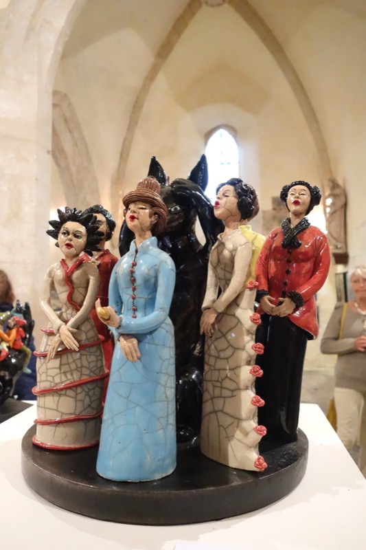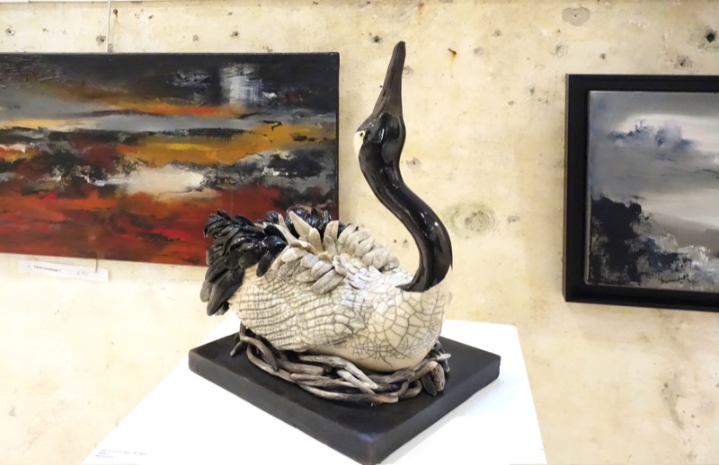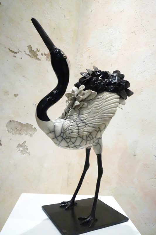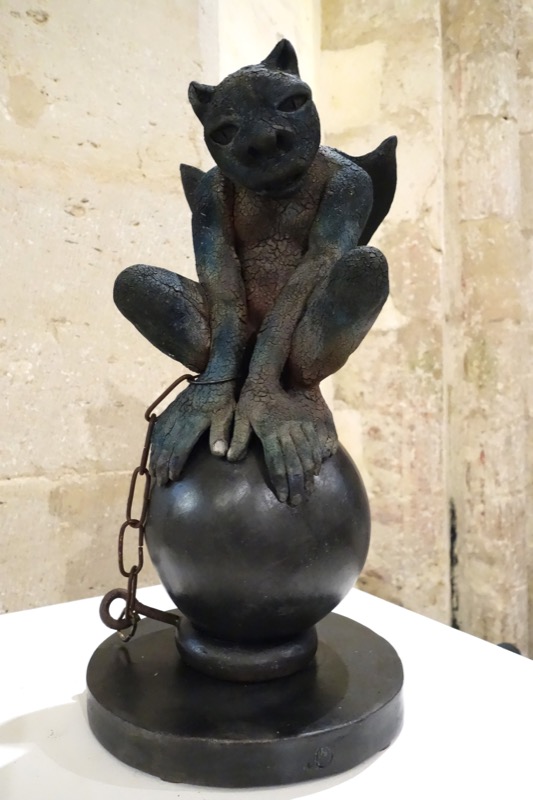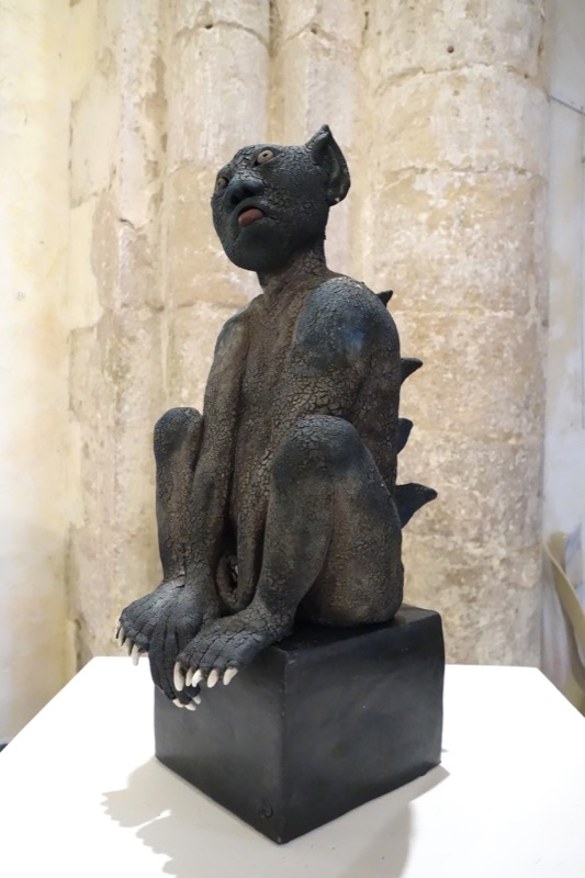 Le dessin, la peinture, la sculpture habillée d??un émail ??raku? ou d??engobe constituent son univers artistique. Elle laisse libre cours à sa créativité pour façonner personnages, animaux, totems? La plasticité de l??argile permet de créer des mouvements, transcrire des attitudes, postures ; le craquelé de l??émail, sa singularité variant à l??infini ; l??enfumage ; une touche primitive ou subtilement métallisée. La terre réfractaire pour modeler, le feu pour cuire, l??air pour craqueler l??eau pour révéler : ces éléments font que chaque sculpture est unique.