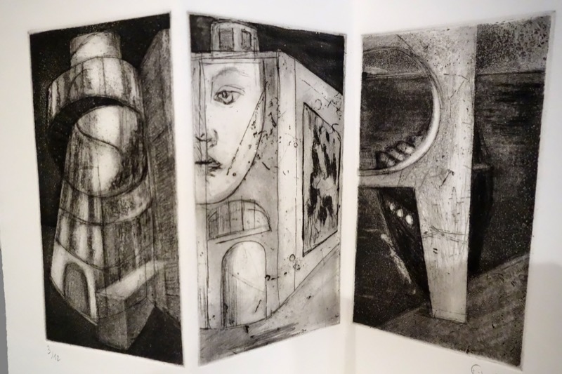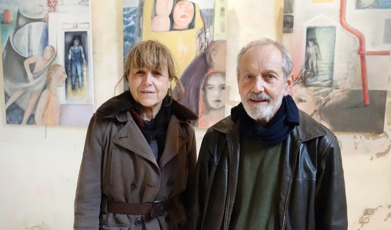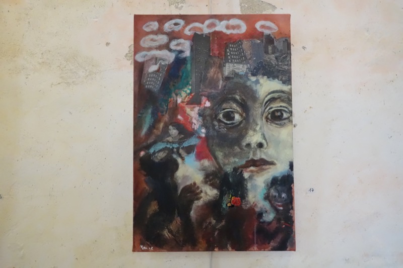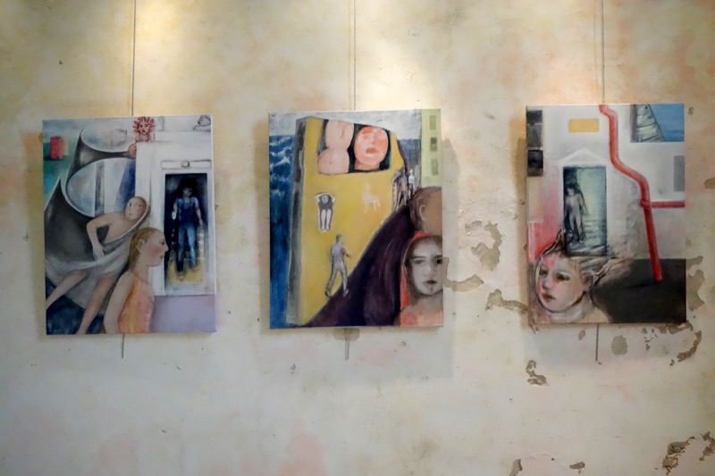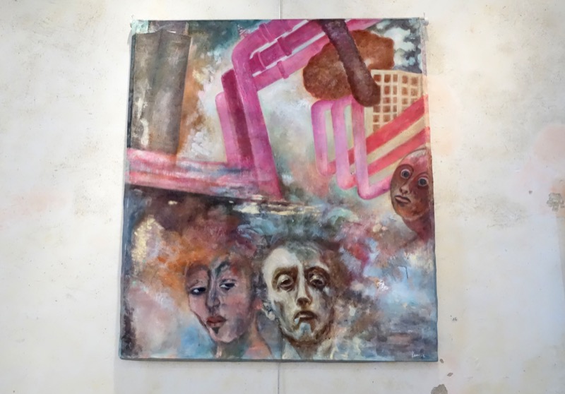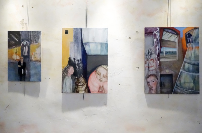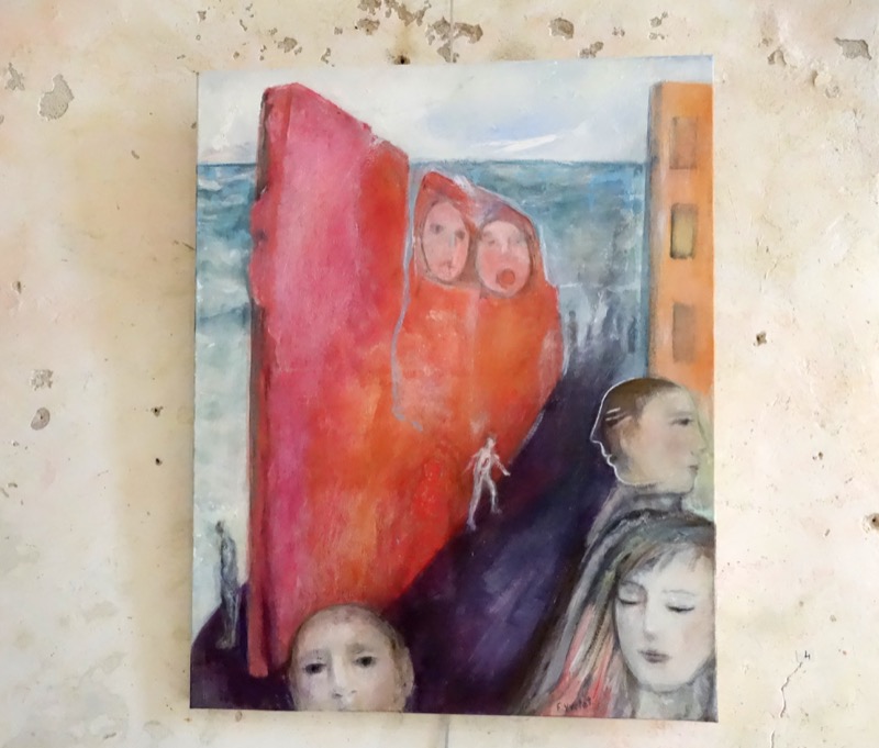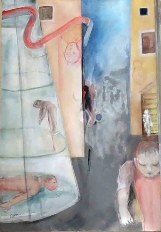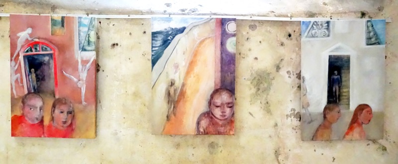 Les personnages habitent des espaces colorés, font parfois obstacle des murs de pierre, dâ??eau, des pyramides de verreâ?¦, contextes de fictions urbaines. Les visages ne cherchent pas à être particularisés, les scènes restent ouvertes à lâ??interprétation. Ainsi les peintures laissent apparaître dans une matière fluide des strates de sensations, de souvenirs, de rappels anciens ou modernistes.
