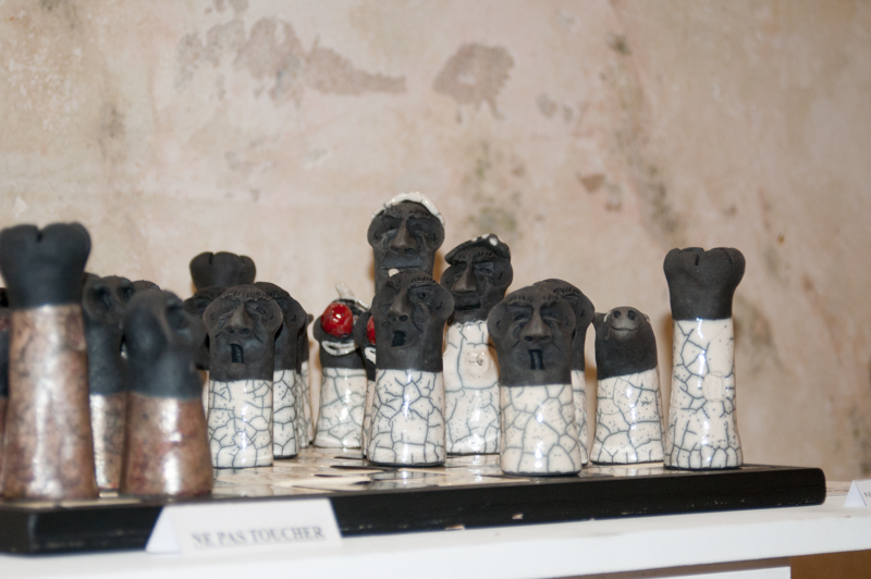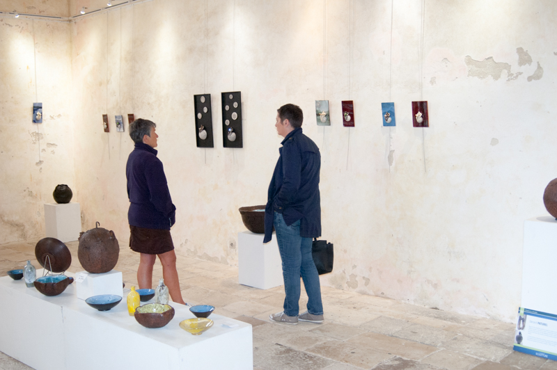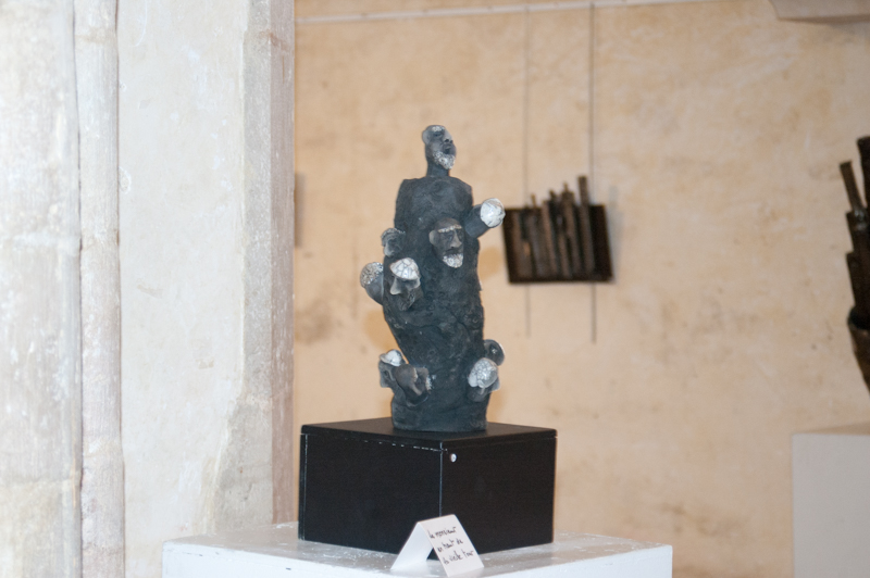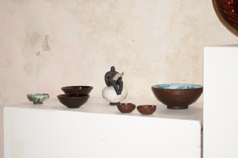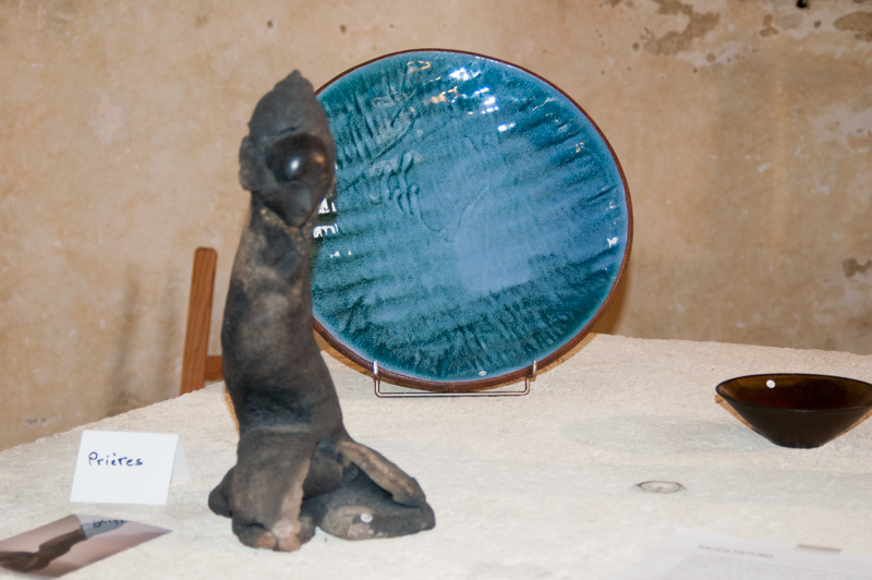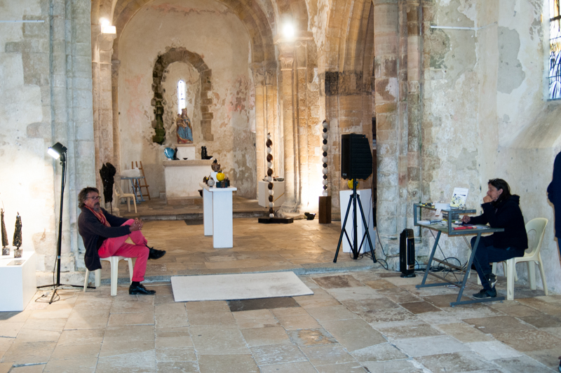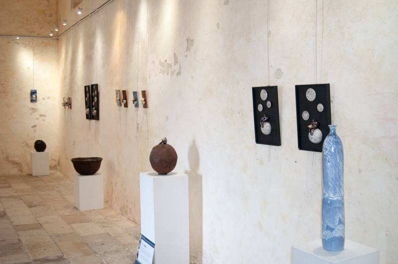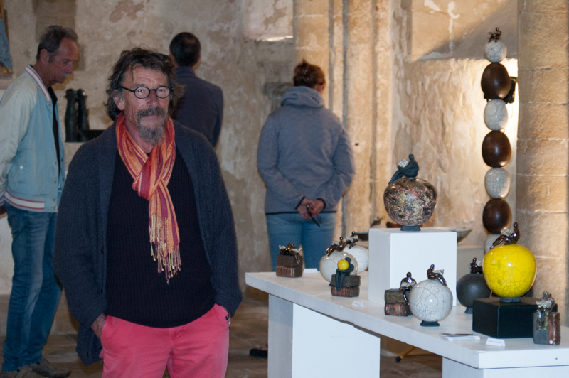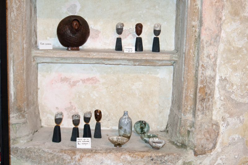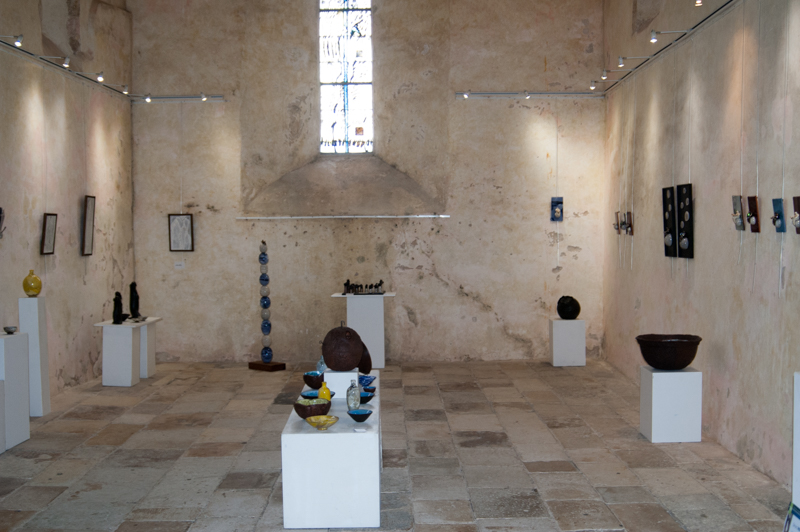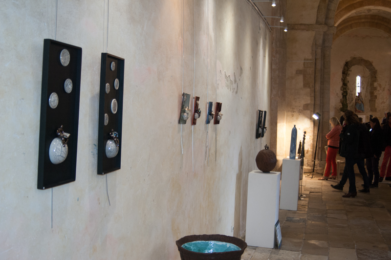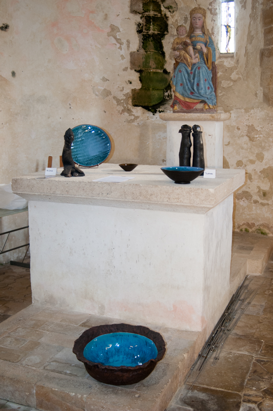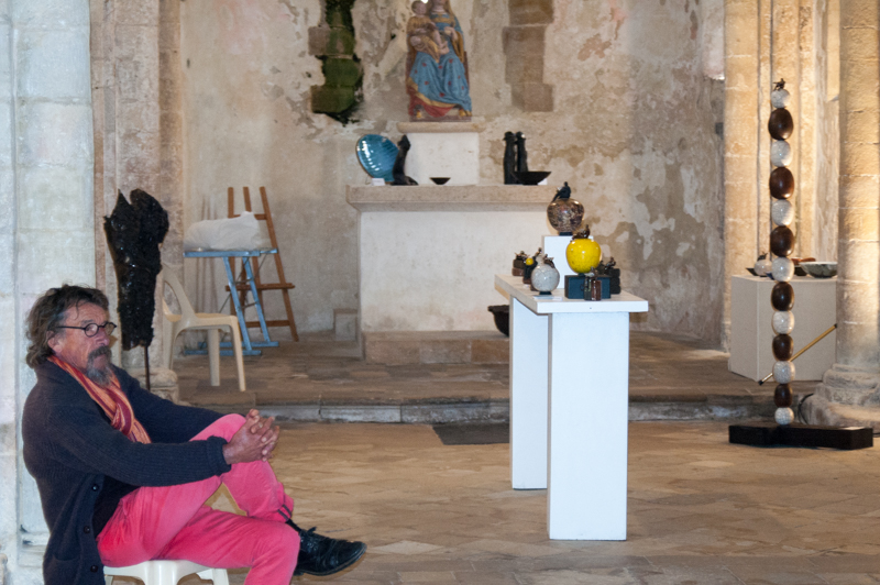 Passages heureux dans cette église au-delà du temps, rencontres épanouissantes. Toujours revenir au point de départ en se renouvelant tout en restant soi-même. Avancer en poésie� Sculptures céramiques , bols ,coupes , masques , totems , petits personnages occupés à lire et quelques incursions sur les murs, de collages et tableaux divers. Deux semaines lumineuses en perspective entre mer et pierres�