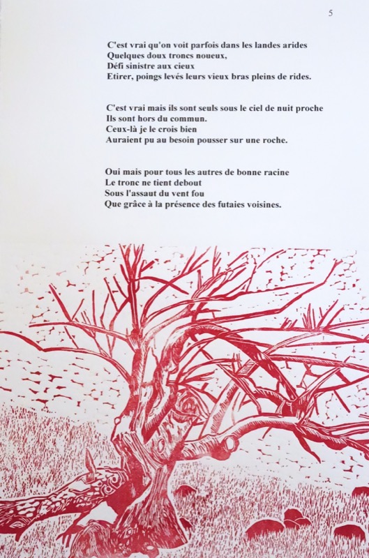 Câ??est vrai quâ??on voit parfois dans les landes arides quelques doux troncs noueux, défi sinistre aux cieux, étirer, poings levés leurs vieux bras pleins de rides. Câ??est vrai mais ils sont seuls sous le ciel de nuit proche. Ils sont hors du commun. Ceux-là je le crois bien auraient pu au besoin pousser sur une roche. Oui mais pour tous les autres de bonne racine, le tronc ne tient debout sous lâ??assaut du vent fou que grâce à la présence des futaies voisines.
